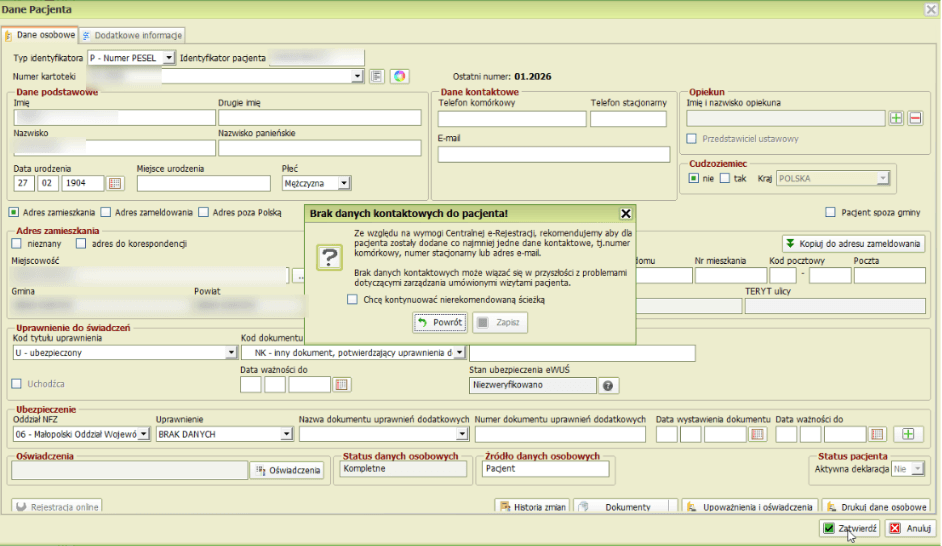 W aplikacji wprowadzono nową walidacje danych osobowych pacjenta. W trakcie wprowadzania nowego pacjenta oraz rejestracji wprowadzono nowe okno informujące użytkownika że konieczne jest podanie minimalnie jednej informacji kontaktowej np. numeru telefonu komórkowego, numeru telefonu stacjonarnego lub adresu e-mail
