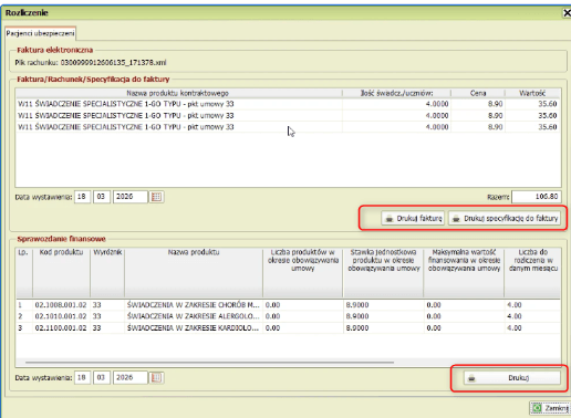 Po wygenerowaniu faktury KSeF i kliknięciu w przycisk „Zatwierdź” umożliwiono wydruk faktury, specyfikacji do faktury oraz sprawozdania finansowego